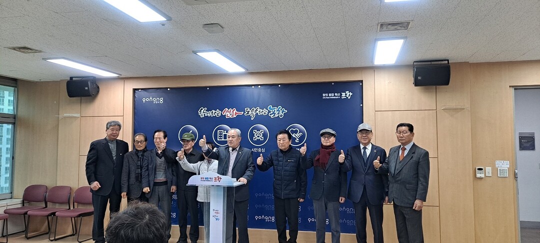 | ▲ 전 포항시의원들이 26일 포항시청 브리핑룸에서 공원식 포항시장 예비후보를 지지 선언했다. [장영태 기자] |