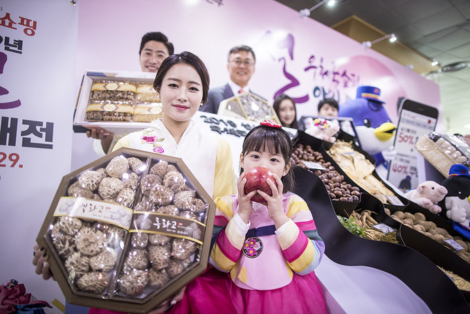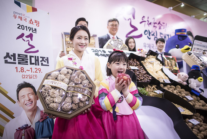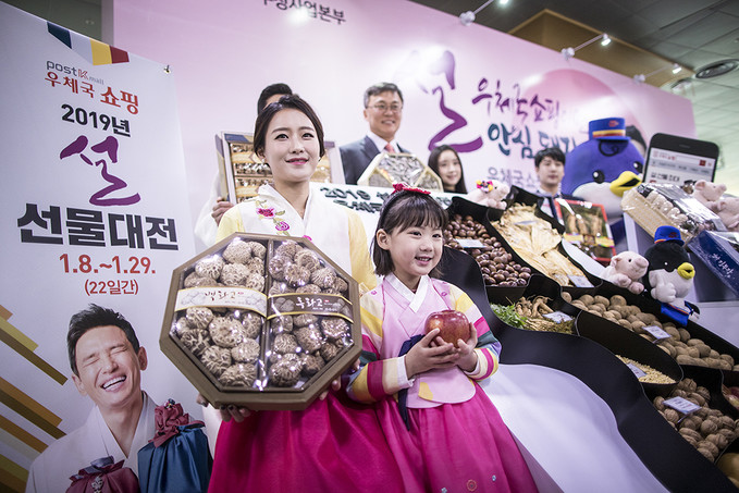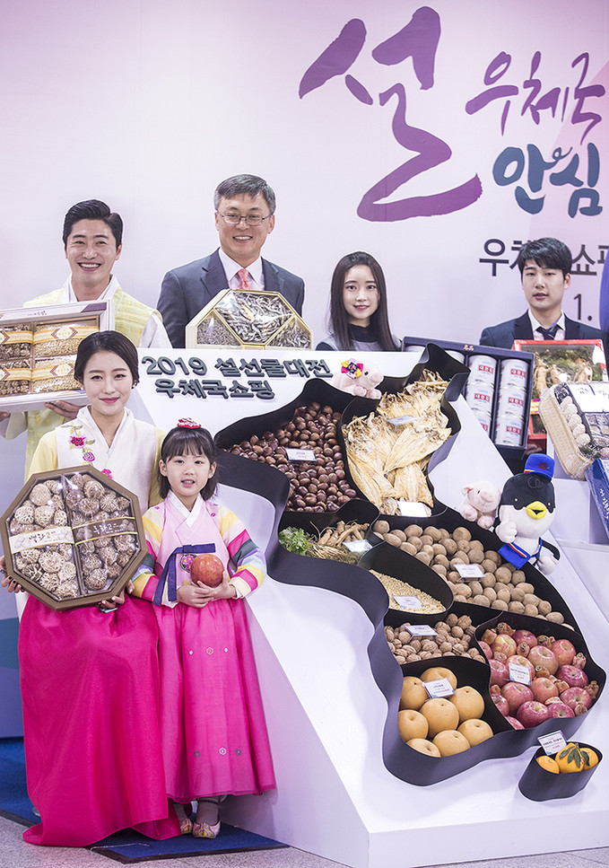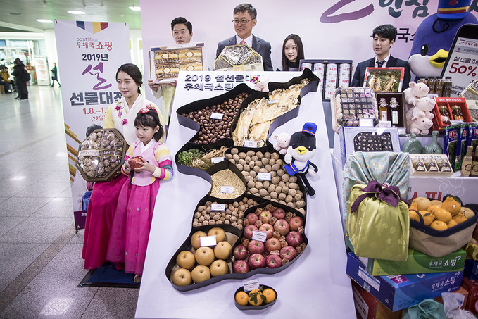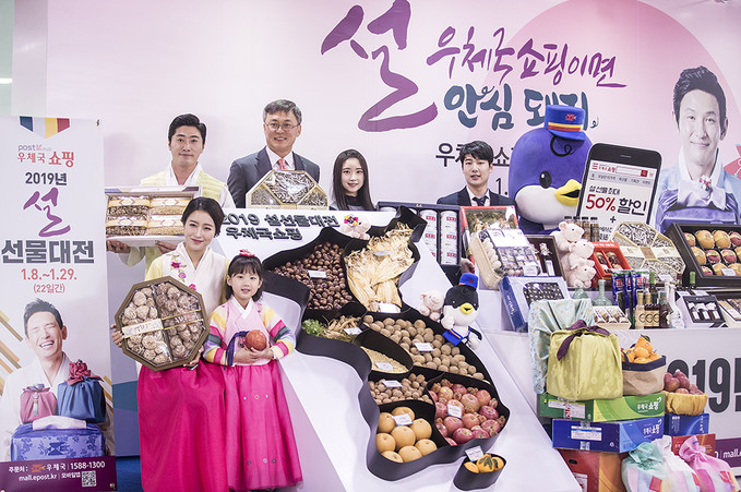 강성주 우정사업본부 본부장 등 관계자들이 8일 오전 서울 용산구 서울역 대합실에서 2019 우체국쇼핑 설 선물세트를 들고 기념촬영을 하고 있다. 우체국쇼핑은 설 명절을 맞아 오는 29일까지 우리특산물과 생활용품을 최대 50%까지 할인 판매하는 ‘2019년 설 선물 할인대전’을 연다.
