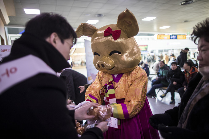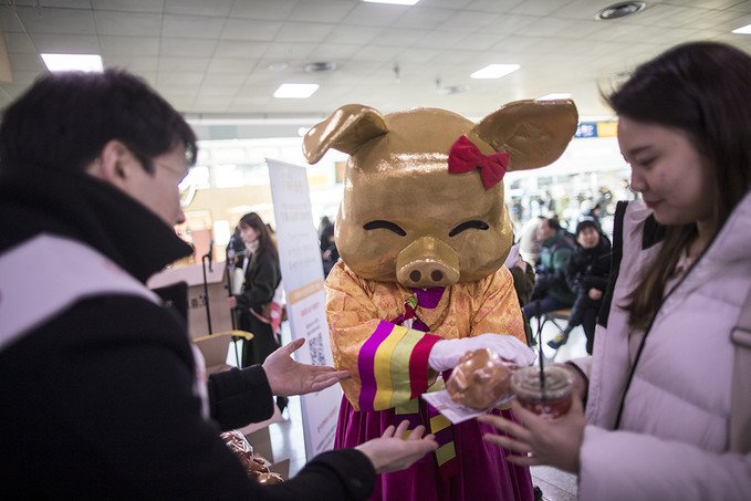 강성주 우정사업본부 본부장 등 관계자들이 8일 오전 서울 용산구 서울역 대합실에서 시민들에게 돼지 저금통을 나눠주고 있다. 우체국쇼핑은 설 명절을 맞아 오는 29일까지 우리특산물과 생활용품을 최대 50%까지 할인 판매하는 ‘2019년 설 선물 할인대전’을 연다.