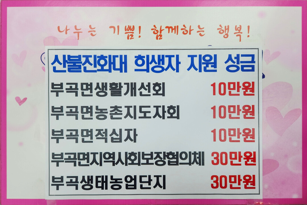 창녕군 부곡면은 다양한 지역 단체들이 산불진화대 희생자 지원을 위한 성금을 기탁하고 있다고 29일 밝혔다.