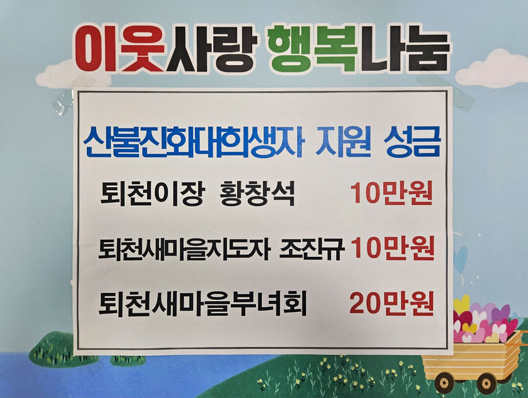 이번 성금 기탁자는 △퇴천 이장 황창석 10만원 △퇴천 새마을지도자 조진규 10만원 △퇴천 새마을부녀회 20만원 등이다.