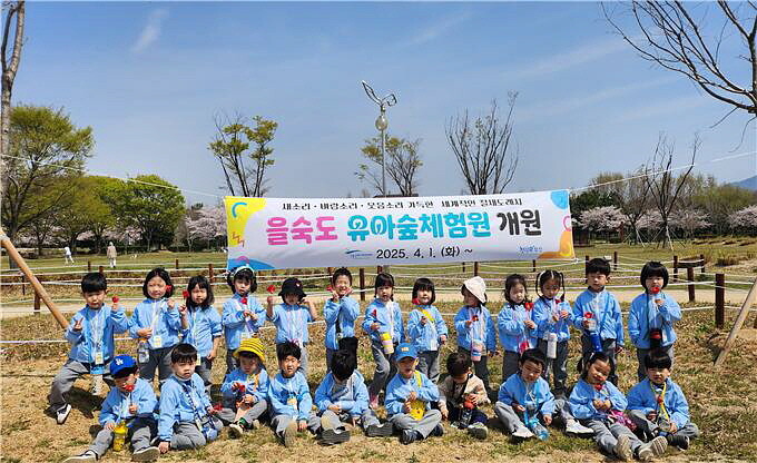 ▲ 지난 1일 개원된 '유아숲체험원' 참가 어린이들이 기념촬영을 하고 있다. [부산시 제공]