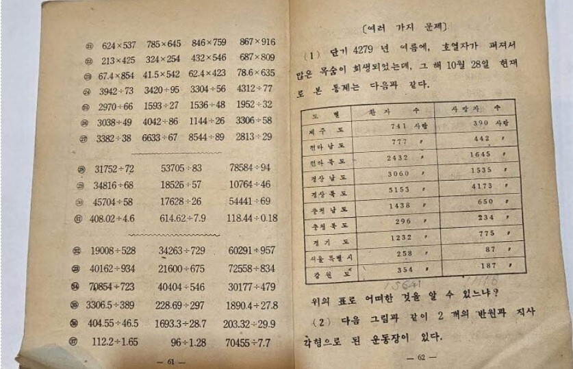 수학책에는 민족의 아픈 역사도 엿볼 수 있다. 미군정청 문교부가 펴낸 '초등 셈본'(1946)을 보면 단기 4279년 여름에 호열자(콜레라)가 퍼져 그해 10월 28일 기준 전국에 1만5641명의 환자가 발생했고, 그중 1만1118명이 사망했다는 통계 기록이 있다.