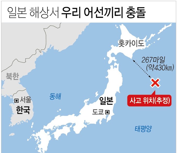 ▲ 일혼 훗카이도 남동쪽 해상서 우리 어선끼리 충돌한 지점 그래픽. [연합뉴스 제공]