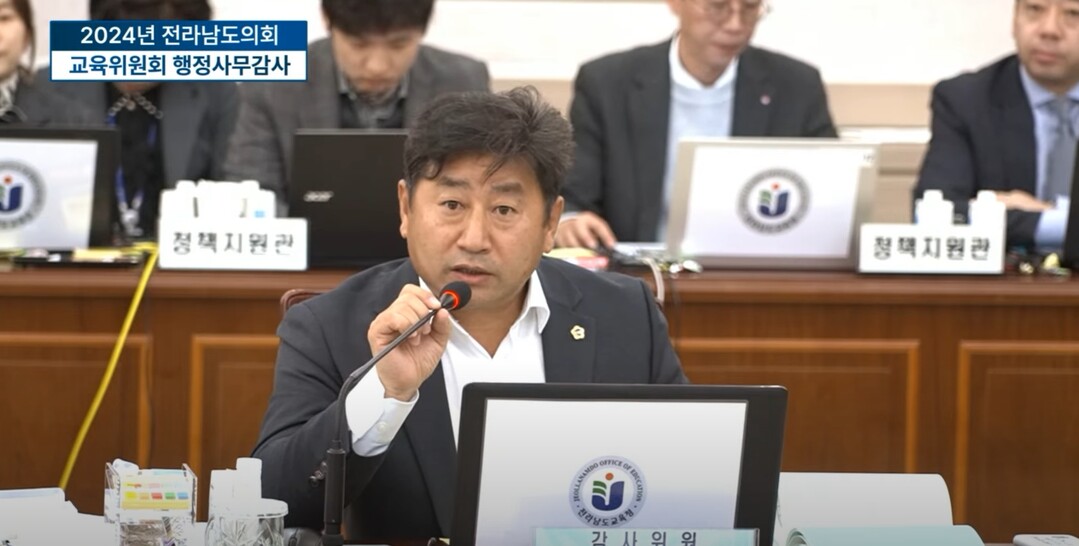 ▲ 12일 전라남도의회 최정훈(더불어민주당, 목포4) 의원이 전남교육청 교육위원회 행정사무감사에서 무상급식에 대해 질의를 하고 있다. [유튜브 갈무리]