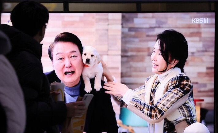 | ▲ 지난 7일 밤 서울 중구 서울역 대합실 텔레비전에서 방영되는 윤석열 대통령의 KBS 신년 대담에서 윤 대통령과 김건희 여사의 사진이 나오고 있다. [뉴시스] |