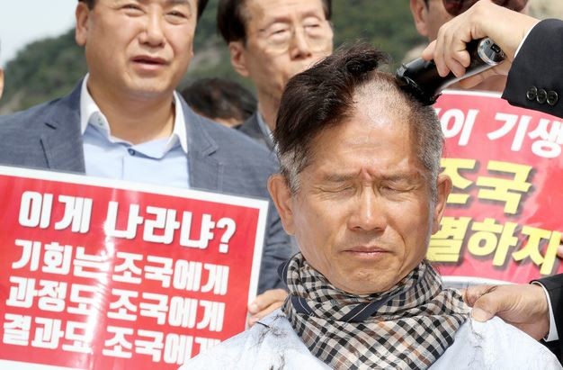 김문수 전 경기도지사가 황교안 자유한국당 대표에 이어 조국 법무부 장관 임명 철회를 촉구하며 삭발했다.