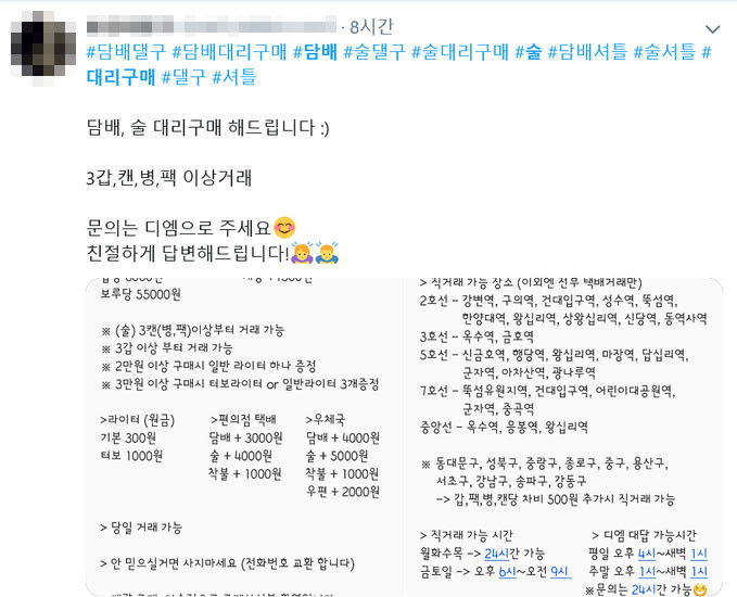 "미성년자 담배, 술 대리구매 해드립니다. 술은 3캔(병,팩) 이상부터, 담배는 3갑 이상부터 거래 가능합니다. 술은 (원금+2000원), 담배는 (원금+2000원)에 팝니다. 택배로 거래하되, 직거래도 가능합니다. 문의는 '디엠' 주세요"