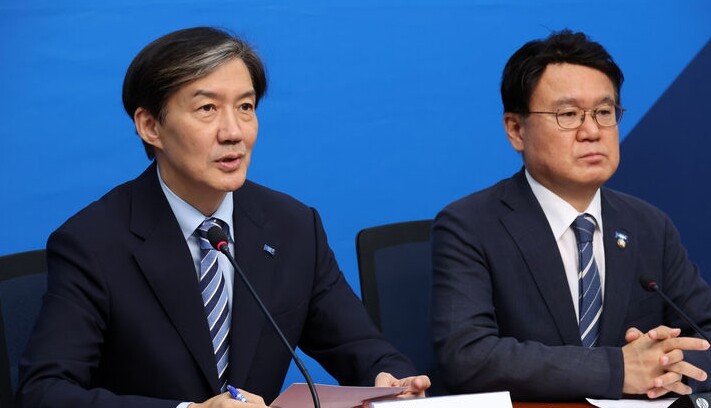| ▲ 조국혁신당 조국 대표(왼쪽)가 23일 국회에서 열린 최고위원회의에서 발언하고 있다. [뉴시스] |