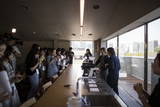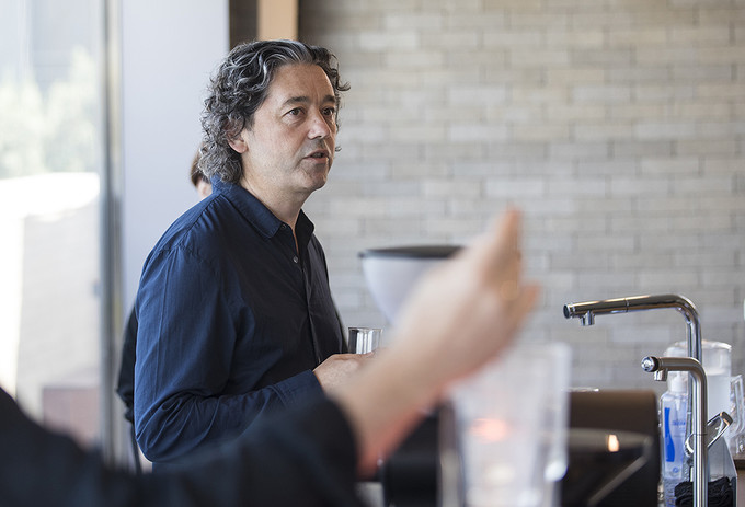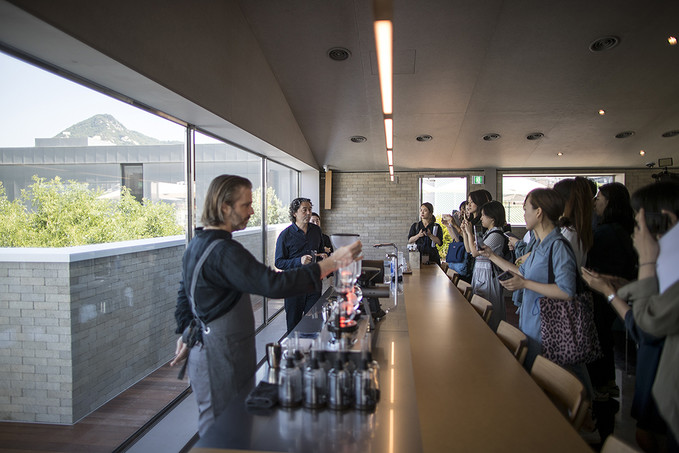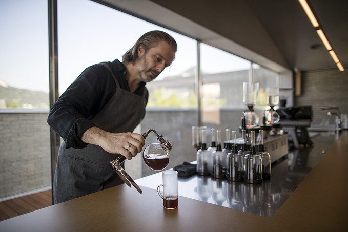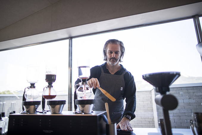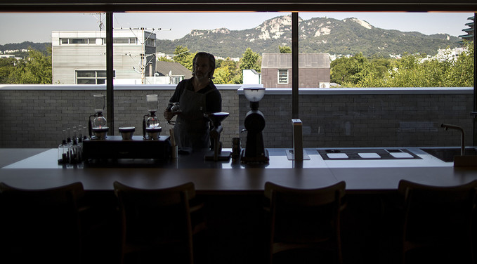 5일 개점한 미국 커피브랜드 블루보틀 국내 2호점인 서울 삼청점에서 블루보틀 카페 문화 총괄 마이클 필립스가 커피 제조시연을 하고 있다. 마이클 필립스는 세계 바리스타 챔피언 수상 경력을 보유했다.