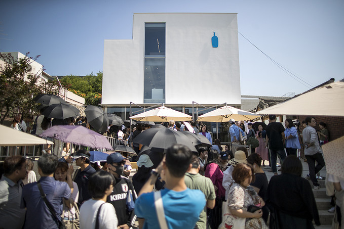 5일 개점한 미국 커피브랜드 블루보틀 국내 2호점인 서울 삼청점을 찾은 시민들이 줄을 서 있다.