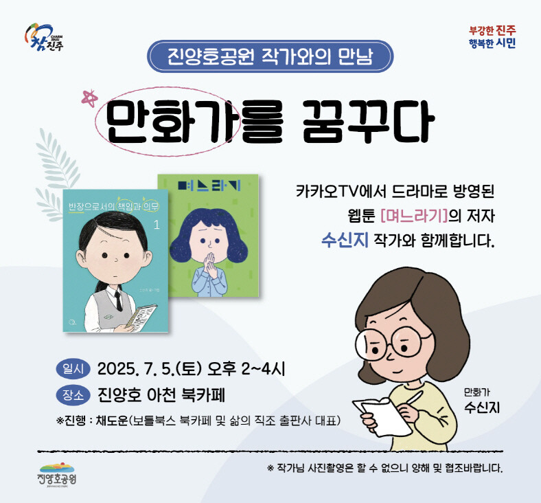 경남 진주시는 7월 5일 오후 2시 진양호공원에 위치한 '아천 북카페'에서 청소년과 성인을 위한 작가와의 만남을 개최한다고 19일 밝혔다.