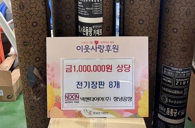 창녕군 대합면은 넥센타이어 창녕공장에서 100만원 상당의 전기장판 8개를 기탁했다고 17일 밝혔다.