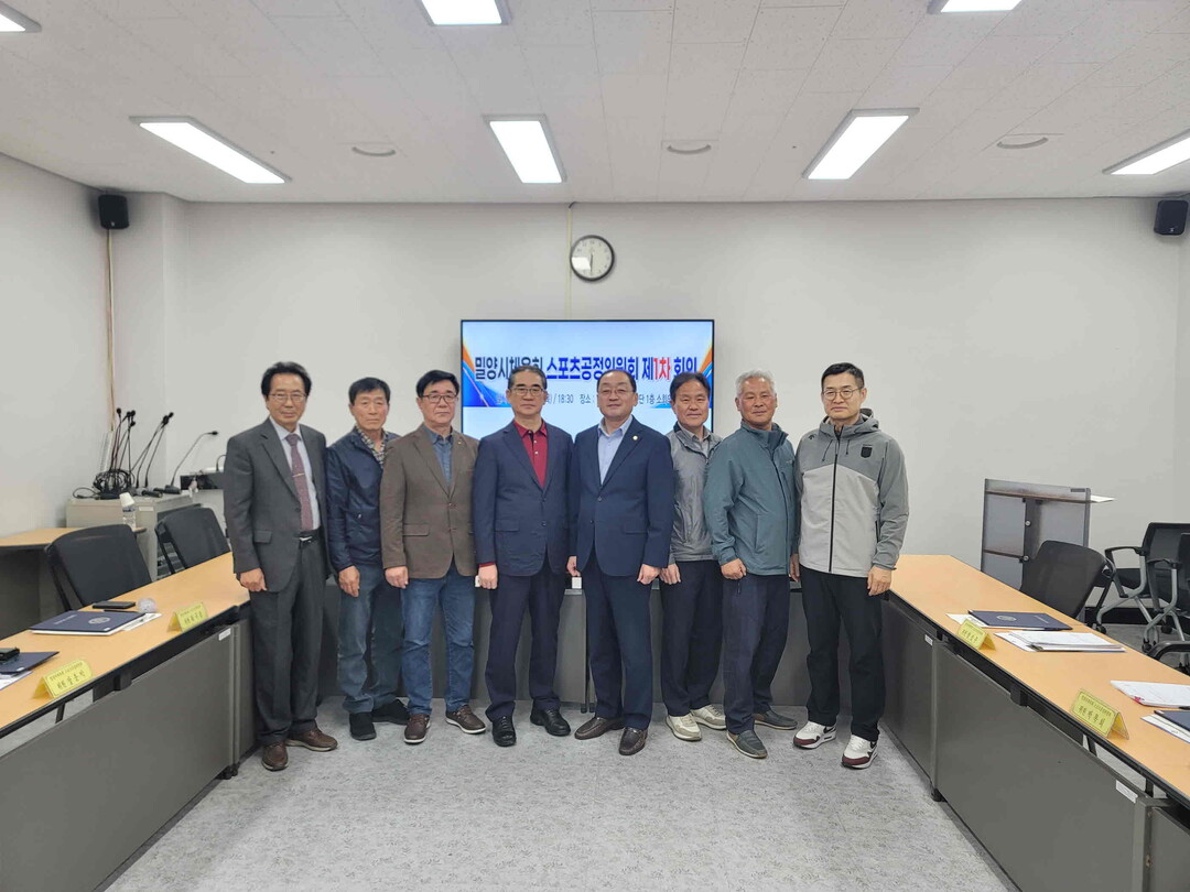 ▲ 27일 시설관리공단 회의실에서 스포츠공정위원회 위원들이 단체촬영을 하고 있다.[밀양시 제공]