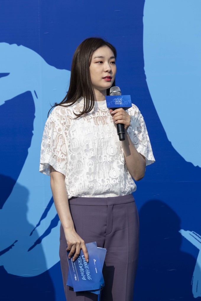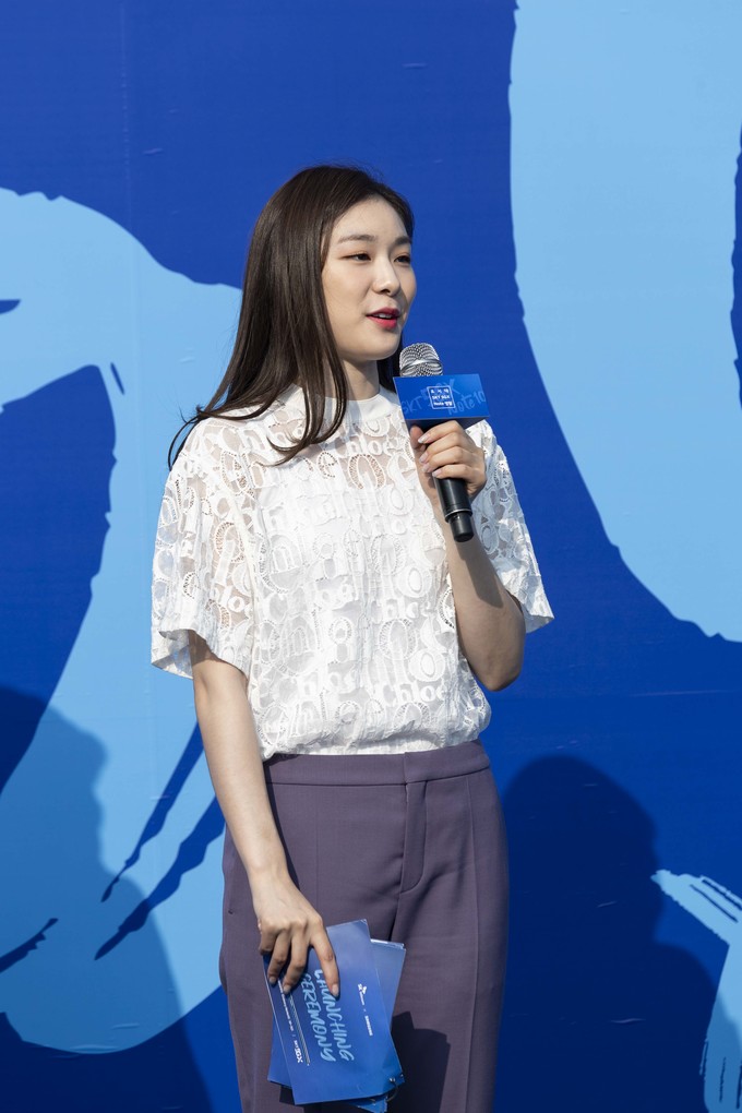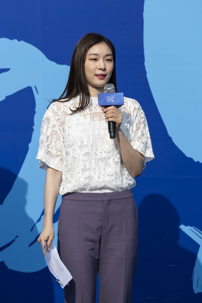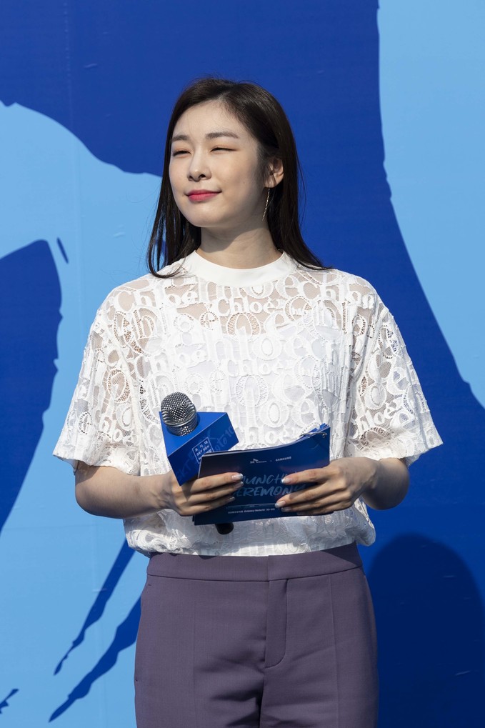 전 피겨스케이트 선수 김연아가 20일 오전 서울 송파구 올림픽공원 SK핸드볼경기장에서 열린 'SKT 갤럭시노트10 공식 개통 행사'에 참석하고 있다.