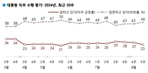 한국갤럽이 이날 공개한 여론조사에서 윤 대통령 국정 수행에 대한 긍정 평가(지지율)는 23%로 나타났다. 지난주와 비교해 무려 4%포인트(p)나 떨어졌다.