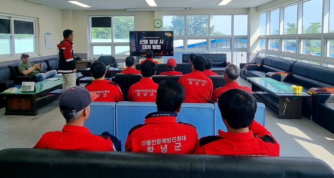 ▲ 창녕군 산불진화대원들이 대형모니터를 활용해 교육을 실시하고 있다.[창녕군 제공]