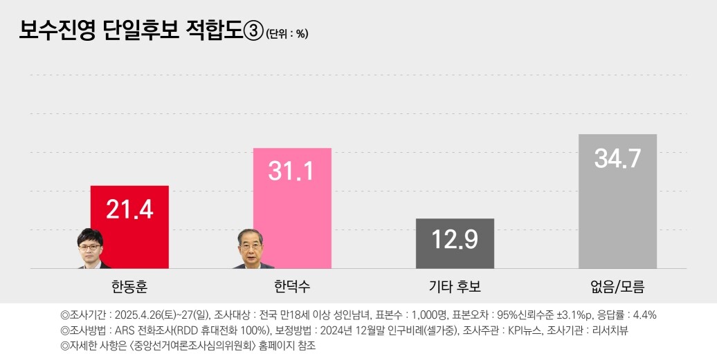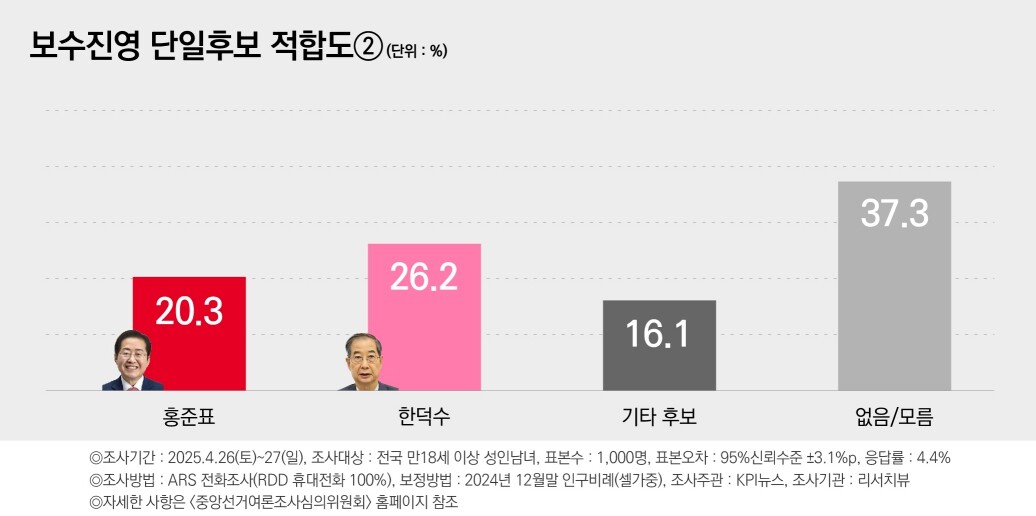 KPI뉴스가 리서치뷰에 의뢰해 지난 26, 27일 전국 만 18세 이상 1000명을 대상으로 여론조사를 실시한 결과 "다음 두 사람 중에서 단일후보를 선출할 경우 누가 더 적합하다고 생각하느냐"는 질문에 한 대행과 홍 후보는 각각 26.2%, 20.3%를 기록했다.