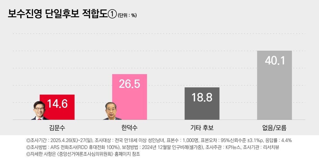 한 대행과 김 후보는 보수진영 단일후보 적합도에서 각각 26.5%, 14.6%로 집계됐다. 격차가 두 자릿수(11.9%p)로 벌어졌다.