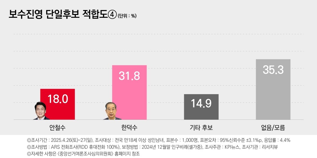 한 대행과 안 후보는 단일후보 적합도에서 각각 31.8%, 18.0%를 기록했다. 격차는 13.8%p로, 다른 세 후보에 비해 가장 컸다.