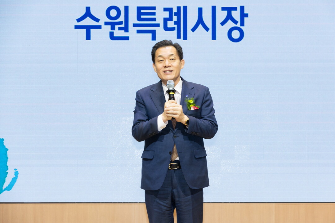 ▲ 10일 열린 '수원시 주민자치협의회 협의회장 이·취임식'에서 이재준 수원시장이 인사말을 하고 있다. [수원시 제공]