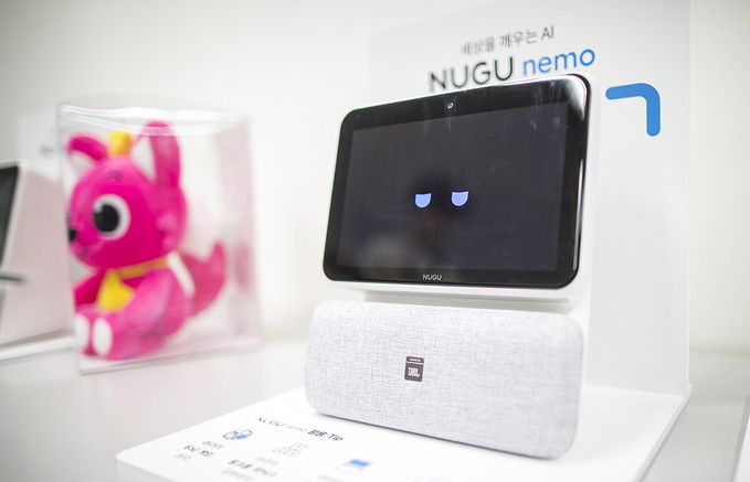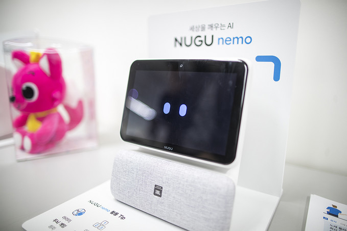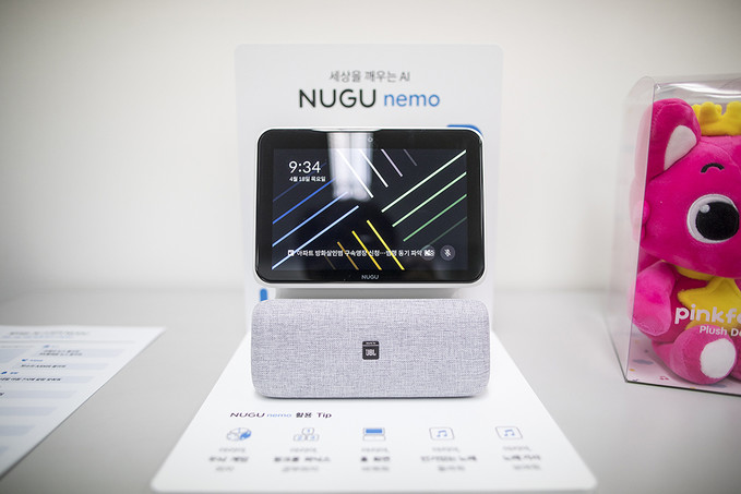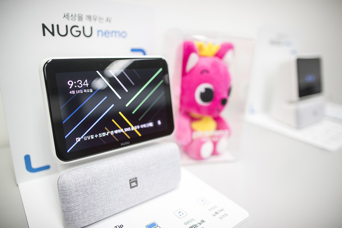 SK텔레콤이 18일 오전 서울 중구 삼화빌딩에서 기존 소리로만 들려주던 정보를 화면으로도 전달하는 디스플레이 탑재형 AI 스피커 ‘누구 네모(NUGU meno)’ 출시 기자회견을 열고 있다.