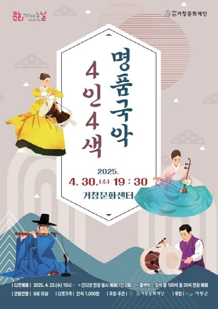 경남 거창문화재단(이사장 구인모 군수)은 오는 30일 오후 7시 30분에 거창문화센터 공연장에서 지역 국악인들의 '명품국악 4인4색'을 개최한다.
