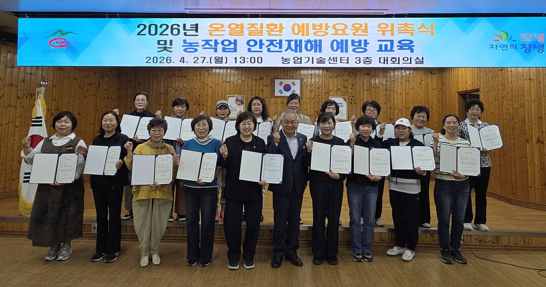 창녕군은 27일 농업기술센터에서 한국생활개선창녕군연합회(회장 차정화) 임원 43명이 참석한 가운데 온열질환 예방요원 위촉식과 농작업 안전재해 예방교육을 실시했다.