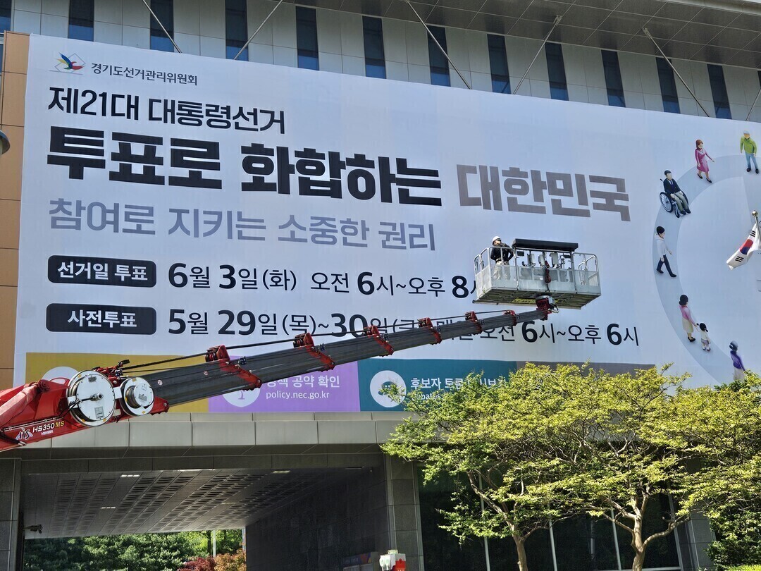 | ▲ 경기도선거관리위원회 청사 전면 외벽에 제21대 대통령선거 투표 참여 홍보 대형 현수막 게시. [경기도선거관리위원회 제공] |