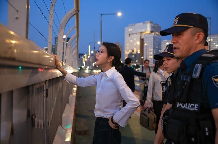 ▲ 윤석열 대통령 부인 김건희 여사가 세계 자살 예방의 날인 지난 10일 자살 예방 및 구조 관계자 격려차 서울 마포경찰서 용강지구대 근무자들과 마포대교 도보 순찰에 동행하며 난간의 와이어를 살펴보고 있다. [대통령실 제공]