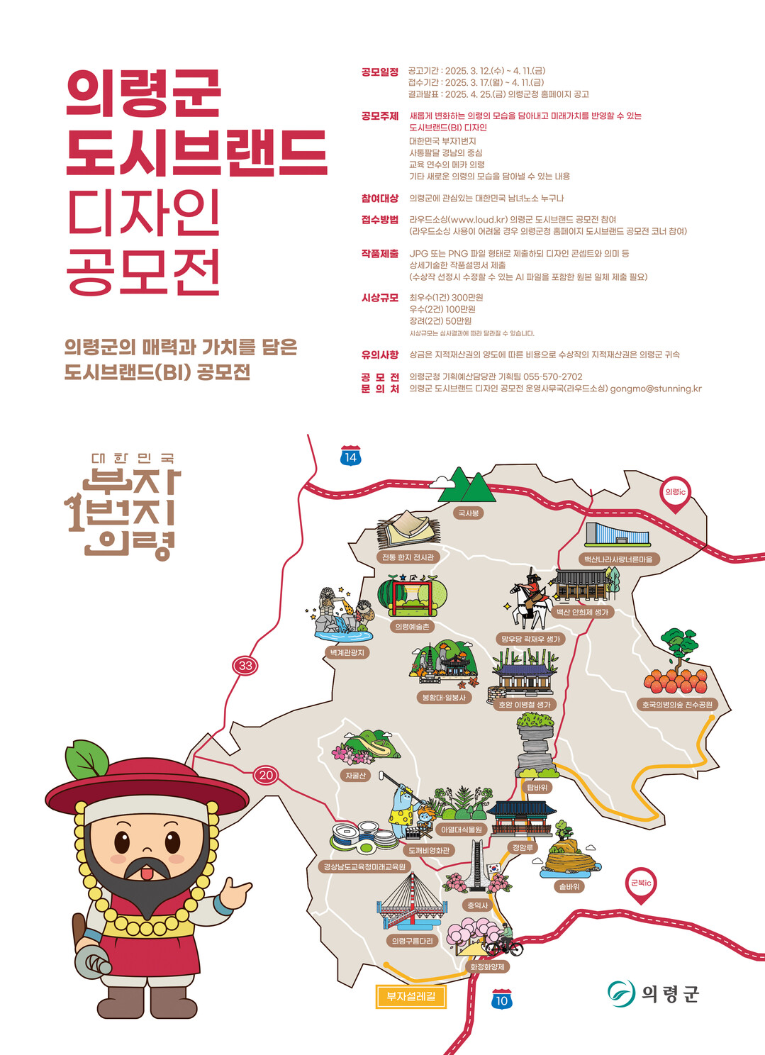 경남 의령군은 '도시브랜드 디자인 공모전'을 개최한다고 18일 밝혔다. 이번 공모전은 의령에 관심 있는 대한민국 남녀노소 누구나 참여할 수 있는 프로젝트다.
