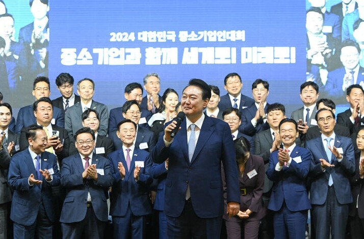 | ▲ 윤석열 대통령이 지난 23일 서울 용산 대통령실 청사 앞 잔디마당에서 열린 '2024 대한민국 중소기업인대회'에서 마무리 발언을 하고 있다. [대통령실 제공] |
