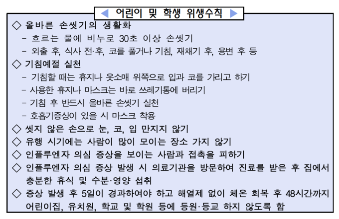 아울러 영유아를 비롯한 학생이 인플루엔자에 걸렸을 경우, 집단 내 전파를 예방하기 위해 증상발생일로부터 5일이 경과하고 해열제 없이 체온 회복된 이후 48시간까지는 어린이집, 유치원, 학교 및 학원 등에 등원·등교를 하지 말 것을 당부했다.