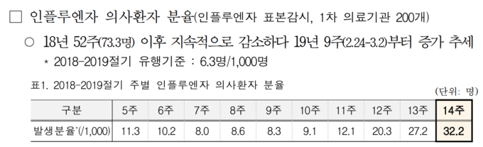 외래환자 1000명당 의사환자는 10주(3월 3일~9일) 9.1명, 11주(3월 10일~16일) 12.1명, 12주(3월 17일~23일) 20.3명, 13주(3월 24일~30일) 27.2명, 14주(3월 31일~4월 6일) 32.2명으로 계속 증가했다.
