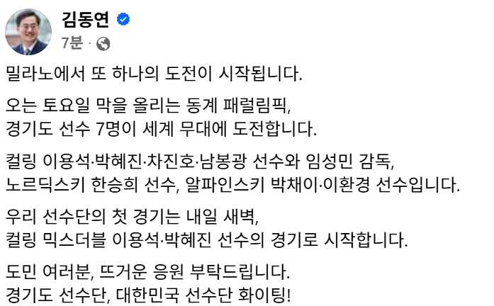 김동연 경기도지사가 4일 "밀라노에서 또 하나의 도전이 시작된다"고 밝혔다.