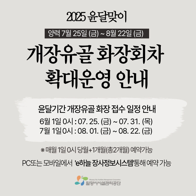 밀양시시설관리공단은 윤달 기간 유골 화장 수요 급증에 대비, 오는 7월 25일부터 8월 22일까지 공설화장시설의 개장 화장 횟수를 기존 하루 3구에서 최대 12구로 확대 운영한다고 밝혔다.