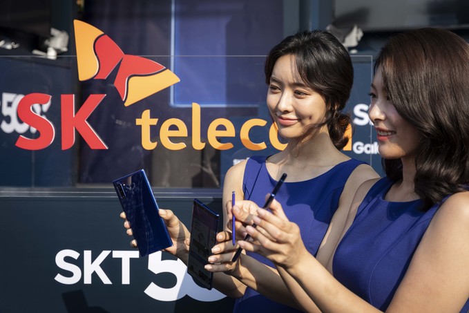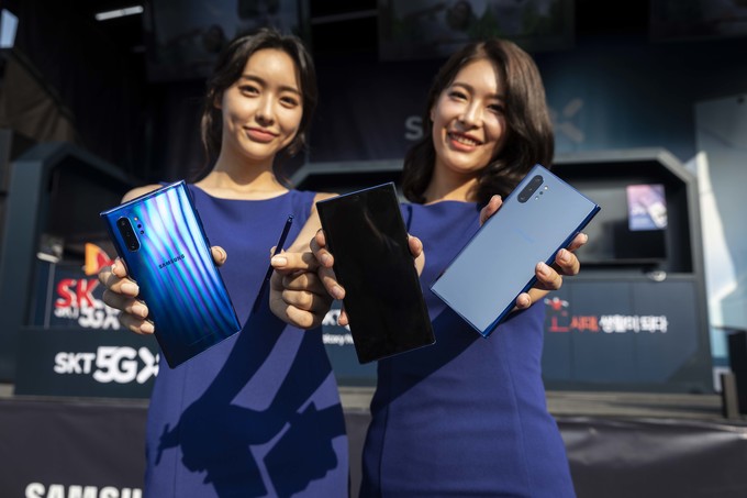 SKT 갤럭시노트10 공식 개통 행사가 20일 오전 서울 송파구 올림픽공원에서 열린 가운데 모델들이 갤럭시노트10을 들고 포즈를 취하고 있다.