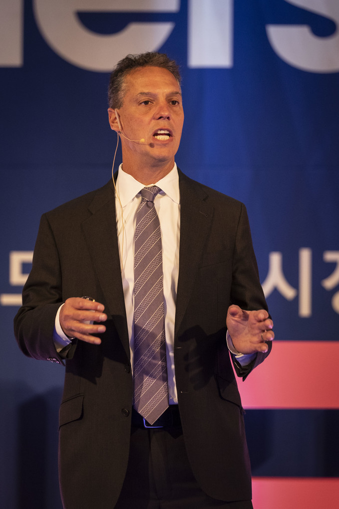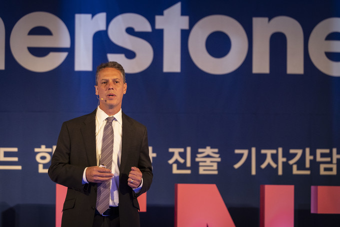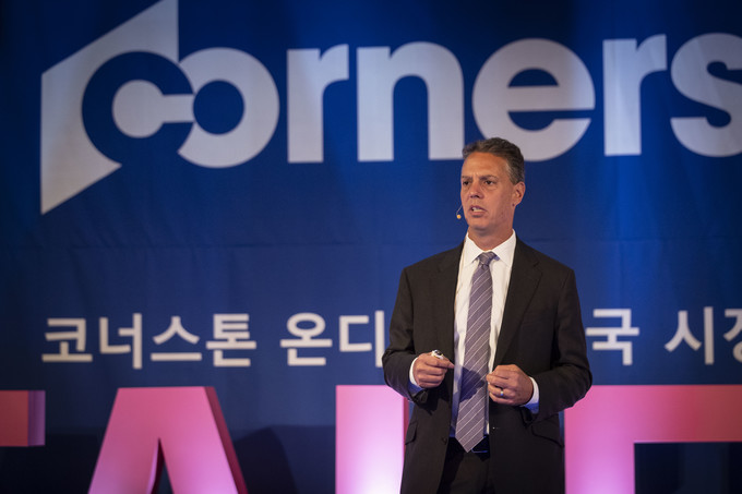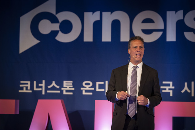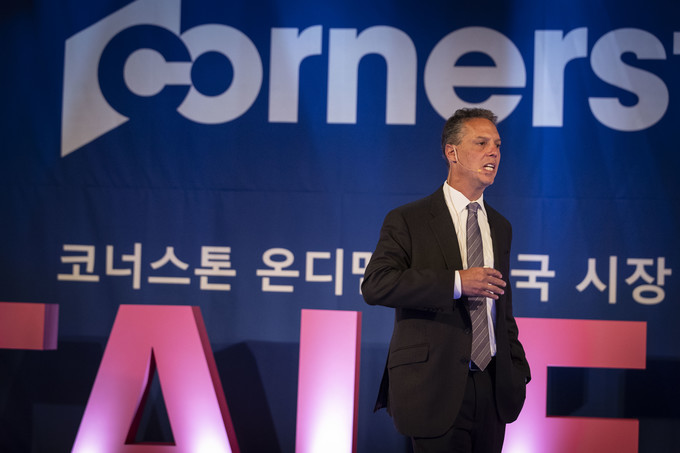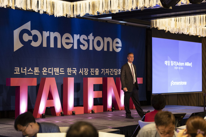 '코너스톤 온디맨드' 애덤 밀러(Adam Miller) CEO가 12일 오전 서울 종로구 포시즌호텔에서 열린 '코너스톤 온디맨드 한국 진출 기자간담회'에 참석해 인사말을 하고 있다.