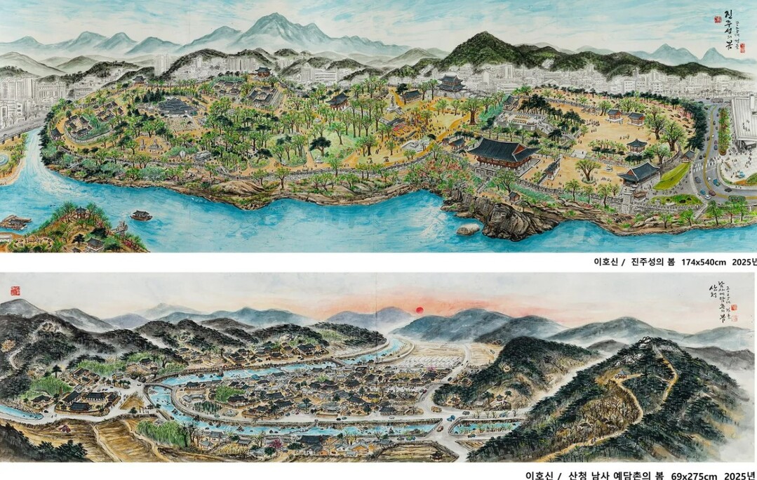 대표 전시작품 '21세기 진주성 전도-진주성의 봄'은 오늘날 진주성의 모습을 담고 있다. 작가는 2년간 현장답사와 전문가 자문, 문헌 탐독을 거치며 성 안팎의 건축물과 자연생태를 살폈다.