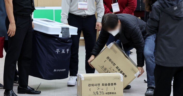 ▲ 지난 6일 서울 강북구 강북구청에 마련된 수유3동 사전투표소에서 선거 사무원 등 관계자들이 사전투표함을 이송 차량으로 옮기고 있다. [뉴시스]