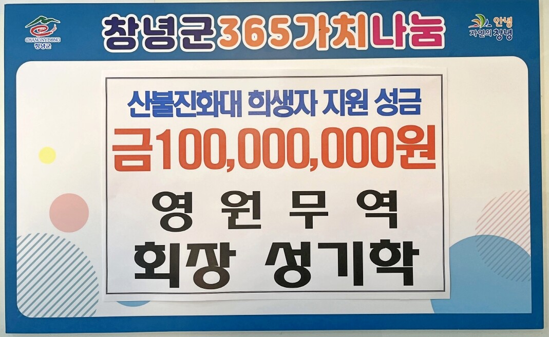 경남 창녕군은 영원무역 성학기 회장이 창녕 산불진화대 희생자 지원을 위한 성금 1억 원을 기탁했다고 4일 밝혔다.
