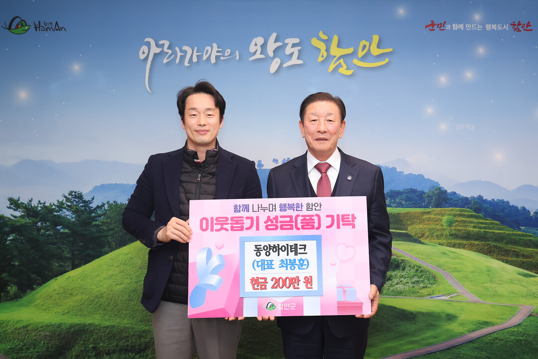 함안군은 지난 3일 금속 및 비철금속 특수구조물 도장 조립 납품 업체 동양하이테크(대표 최봉훈)에서 어려운 이웃을 위한 성금 200만 원을 기부했다고 밝혔다.