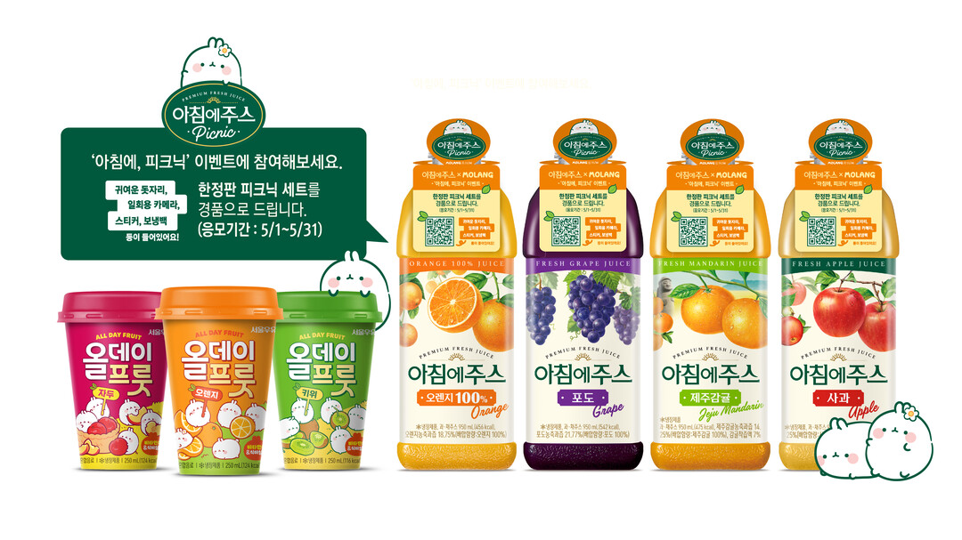 서울우유는 인기 캐릭터 '몰랑'을 더한 올데이프룻 시즌팩 행사와 아침에주스 한정판 피크닉 세트 경품 이벤트를 진행한다.