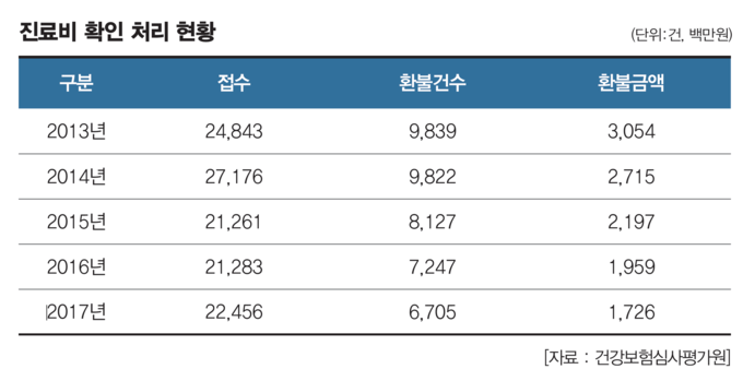 이처럼 상식을 벗어나는 진료비에 의구심을 표시하는 소비자들은 매년 2만 명이 넘는다. 건강보험심사평가원의 '진료비 확인 처리 현황'에 따르면 2017년 한 해 동안 소비자들이 진료비 확인을 요청한 건수는 2만2456건이었다. 진료비 확인 요청은 비급여로 부담한 진료비가 법령에서 정한 기준에 맞게 적용됐는지를 확인하는 제도다. 같은 해 진료비가 과다하게 청구돼 환불된 건수도 6705건에 달했다. 금액으로 따지면 17억2600여만 원에 이른다.