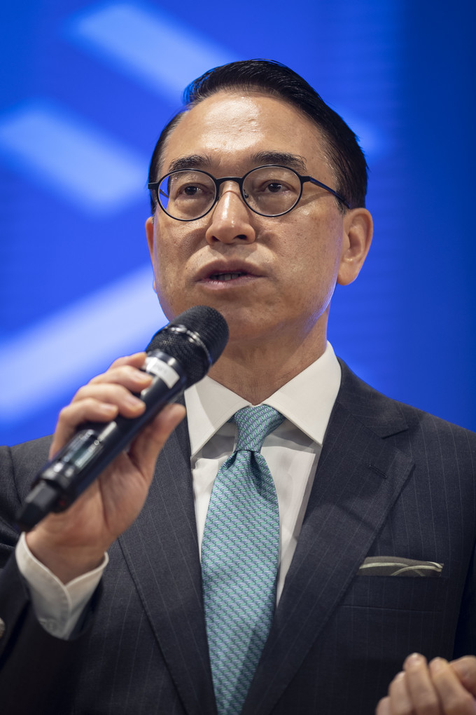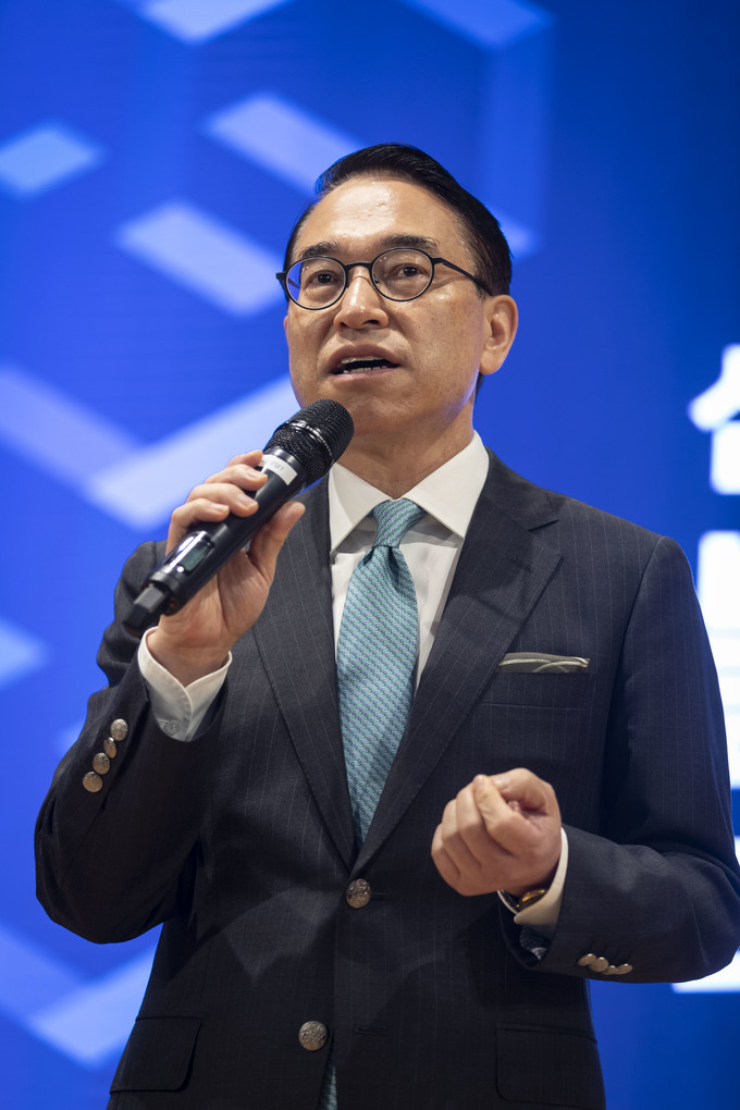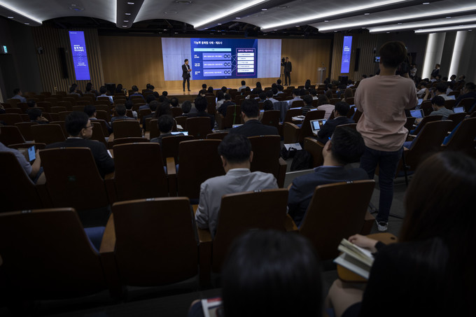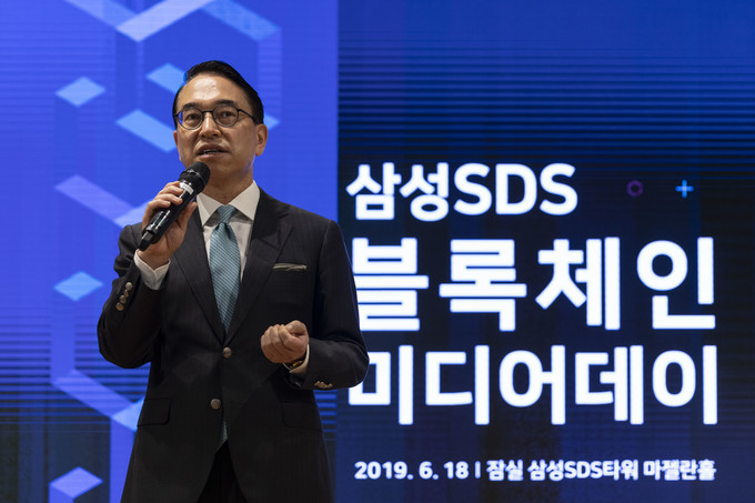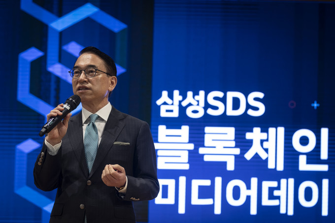 18일 오전 서울 송파구 잠실 삼성SDS타워에서 열린 '블록체인 미디어데이'에서 홍원표 삼성 SDS 대표가 인사말을 하고 있다.