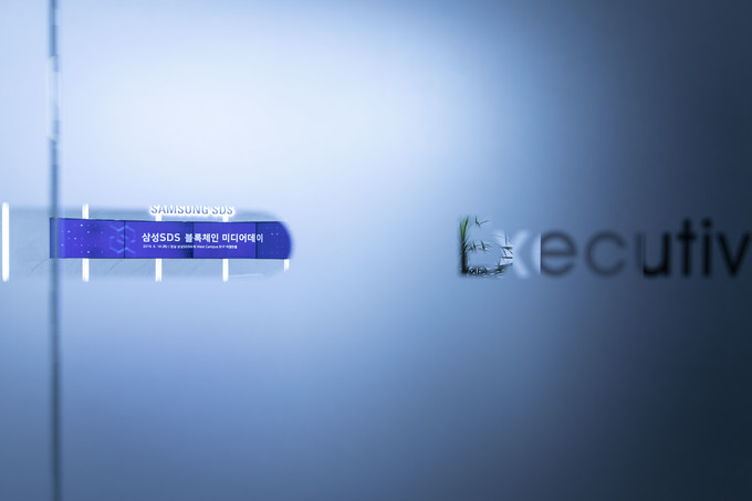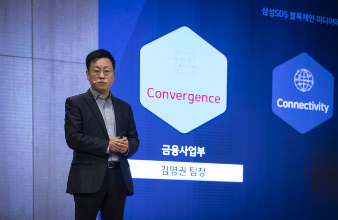 18일 오전 서울 송파구 잠실 삼성SDS타워에서 열린 '블록체인 미디어데이'에서 김영권 삼성SDS 금융사업부 팀장이 인사말을 하고 있다.