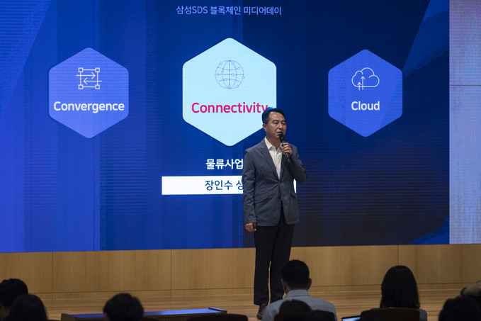 18일 오전 서울 송파구 잠실 삼성SDS타워에서 열린 '블록체인 미디어데이'에서 장인수 삼성SDS 물류사업부 상무가 인사말을 하고 있다.