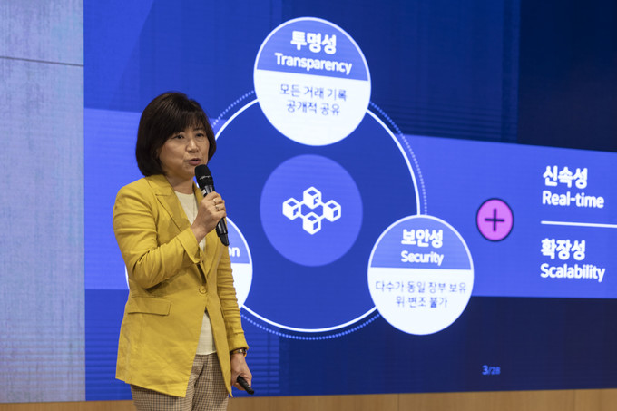 18일 오전 서울 송파구 잠실 삼성SDS타워에서 열린 '블록체인 미디어데이'에서 홍혜진 블록체인센터 전무가 인사말을 하고 있다.