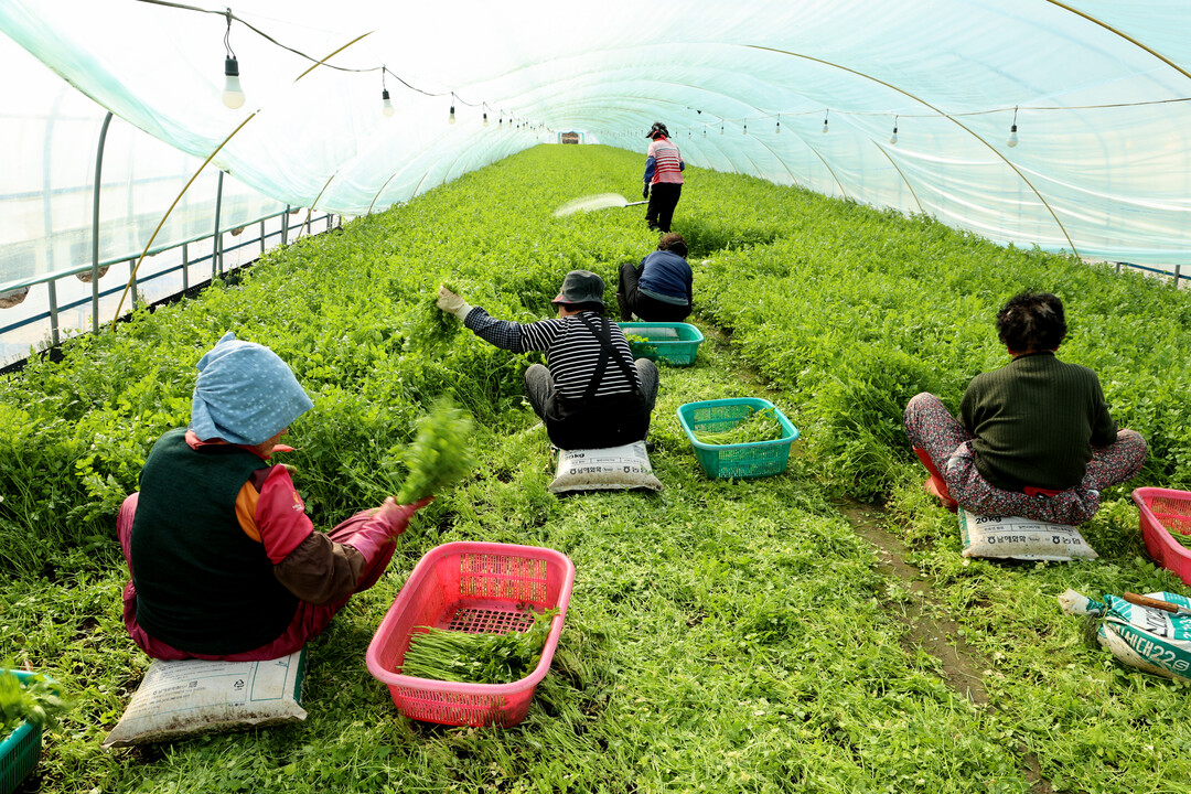경남 의령군 자굴산 기슭에 자리한 가례면 밭미나리 비닐하우스에서 수확작업이 한창이다. 이곳 미나리 수확은 6월까지 계속된다.