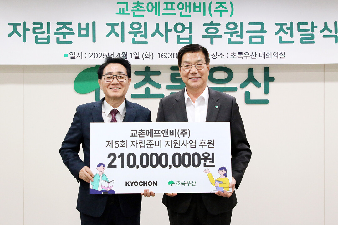후원금 전달식에는 강창동 교촌에프앤비 커뮤니케이션부문장과 황영기 초록우산어린이재단 회장을 비롯한 관계자들이 참석했다. 행사는 지난 1일 서울시 중구에 위치한 초록우산어린이재단에서 진행됐다.